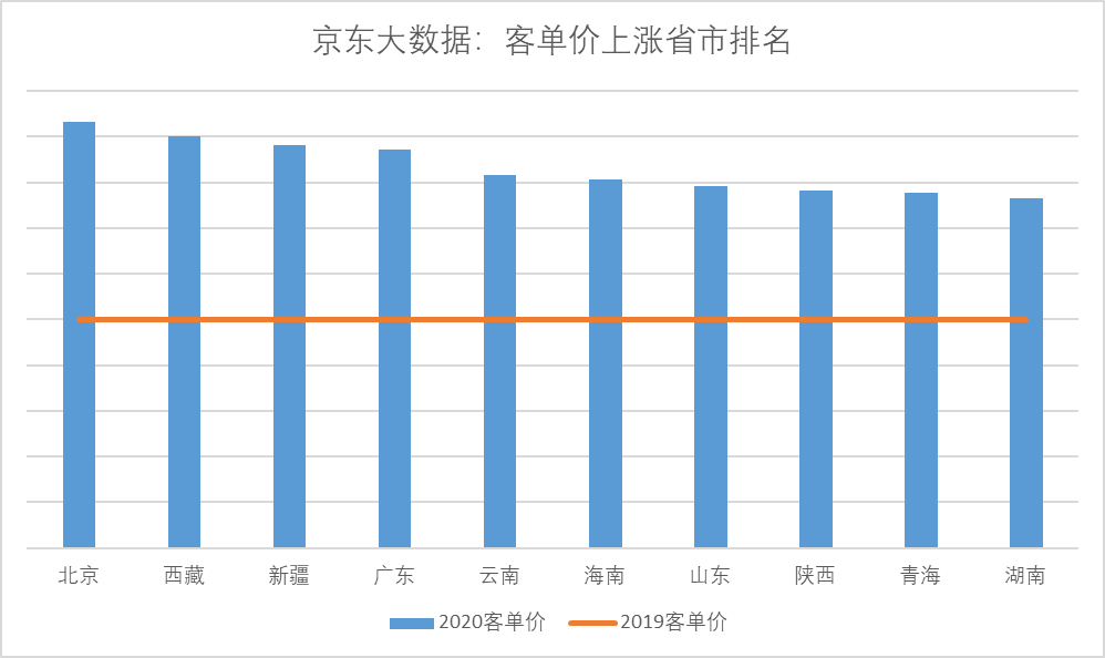 但是,消費者采購月餅時卻呈現(xiàn)出更積極的上升趨勢:據(jù)京東大數(shù)據(jù),今年京東平臺上不但用戶數(shù)大幅增加,其中相當大部分新用戶來自低線市場用戶,而且消費者相比去年更加追求品質(zhì),大品牌、高規(guī)格的月餅禮盒熱銷,因此月餅平均客單價比去年上漲了35%以上。下圖可見,除北京廣東等發(fā)達地區(qū)外,客單價上漲的主要動力來自于西北、西南和華中等地區(qū)。