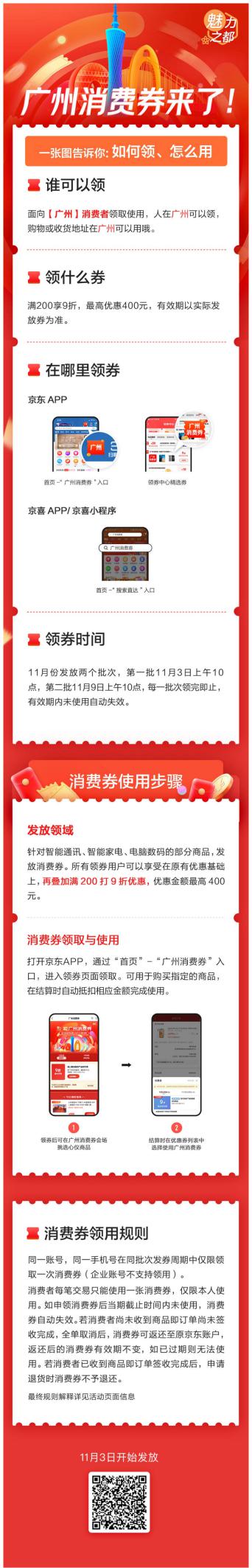 廣州消費(fèi)券將發(fā)放兩個批次,第一批于11月3日上午10點發(fā)放,第二批于11月9日上午10點發(fā)放,領(lǐng)完即止。廣州消費(fèi)券針對手機(jī)通訊、智能家電、電腦數(shù)碼等領(lǐng)域的熱銷產(chǎn)品,有效期6天。