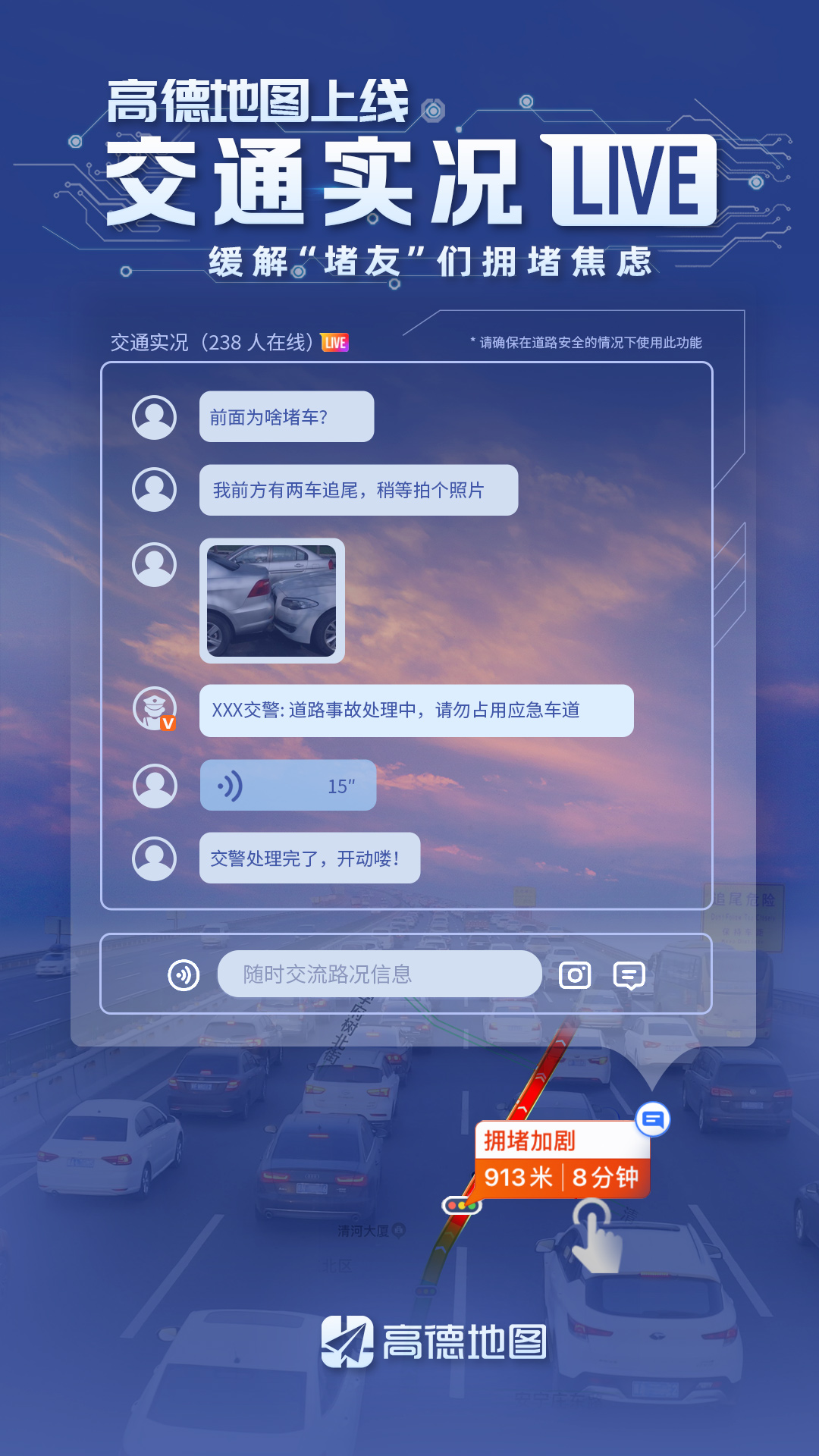 根據(jù)高德地圖的調(diào)研分析,遇到堵車(chē)時(shí),46%的司機(jī)最關(guān)心還會(huì)堵多久,36%的司機(jī)最想知道擁堵原因。隨著擁堵時(shí)間變長(zhǎng),人們的關(guān)注點(diǎn)會(huì)轉(zhuǎn)移到擁堵處理進(jìn)度上,比如交警是否到場(chǎng),事故是否解決等。但由于交通擁堵多為臨時(shí)性偶發(fā),此前沒(méi)有一個(gè)權(quán)威的信息平臺(tái)可以解答這些疑問(wèn)。