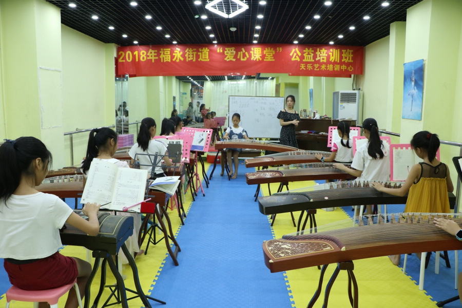 參加“愛心課堂”的小朋友在練習(xí)古箏
