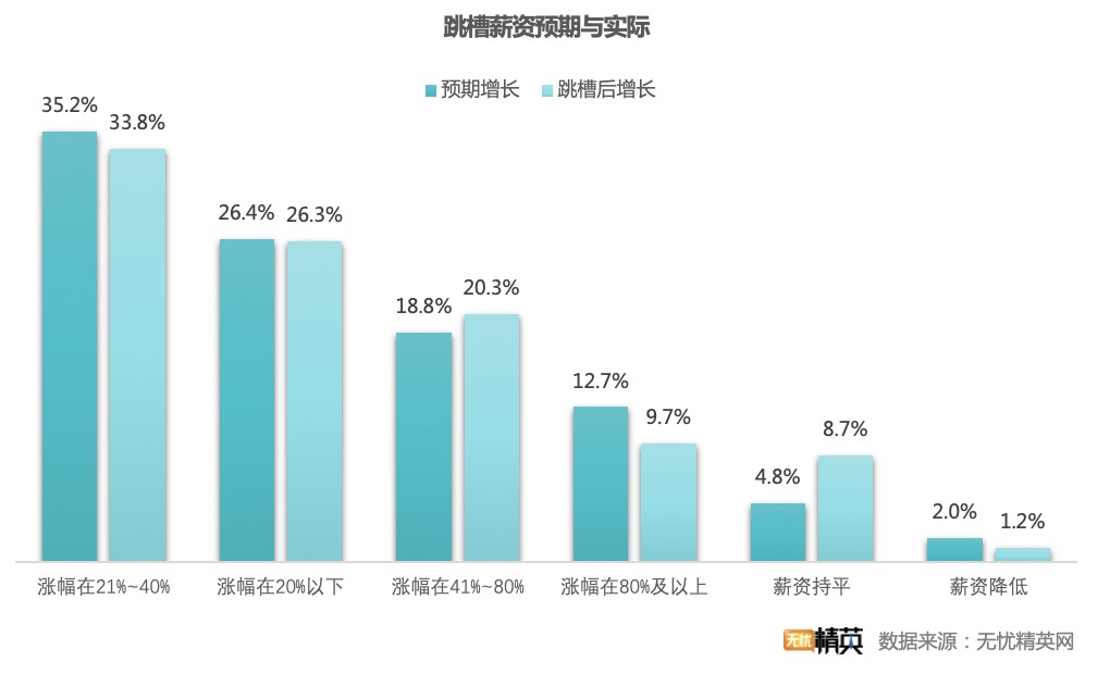 同時(shí)經(jīng)歷了一年的觀望、沉淀,職場(chǎng)精英在求職時(shí)不論是對(duì)工作城市、崗位還是薪資預(yù)期也更加理性。在兩組調(diào)研數(shù)據(jù)中,我們不難發(fā)現(xiàn)此次跳槽多數(shù)職場(chǎng)精英的薪資漲幅在21-40%之間,預(yù)期與實(shí)際增長(zhǎng)之差僅有約3個(gè)百分點(diǎn)。這表明在職場(chǎng)精英對(duì)個(gè)人情況與行業(yè)崗位現(xiàn)狀做詳盡調(diào)查,預(yù)期管理科學(xué)合理。