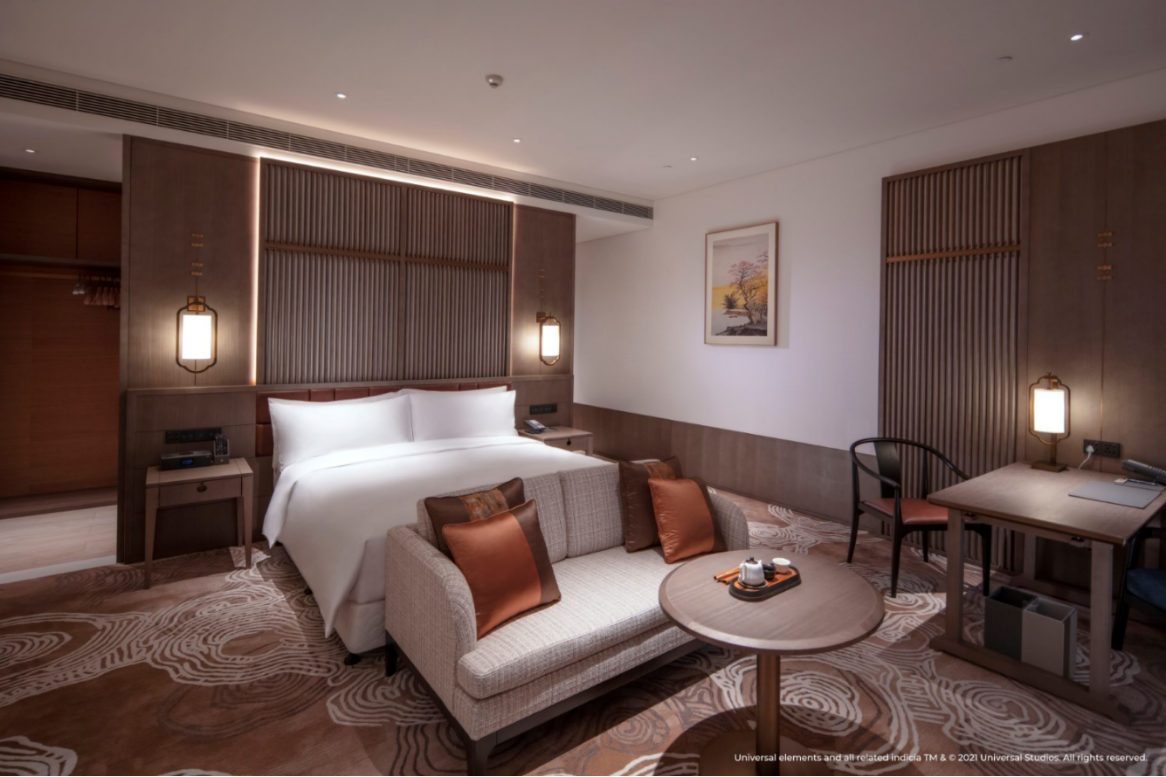 酒店設(shè)計(jì)以當(dāng)代視角詮釋中國(guó)傳統(tǒng)文化及人文歷史底蘊(yùn),兼具現(xiàn)代便捷與奢華典雅。與此同時(shí),400間寬敞雅致的客房設(shè)計(jì)也融入了中國(guó)古典皇家園林的精巧設(shè)計(jì),以天然材料刻畫(huà)自然之美。作為品牌標(biāo)志性的元素之一,所有客房均配備有煮茶套裝,賓客可以在驚險(xiǎn)刺激的主題游園體驗(yàn)之后享受輕松愉悅的茗茶時(shí)光;此外,位于酒店大堂吧的專(zhuān)屬茶室還將提供專(zhuān)業(yè)的互動(dòng)品茗體驗(yàn)。