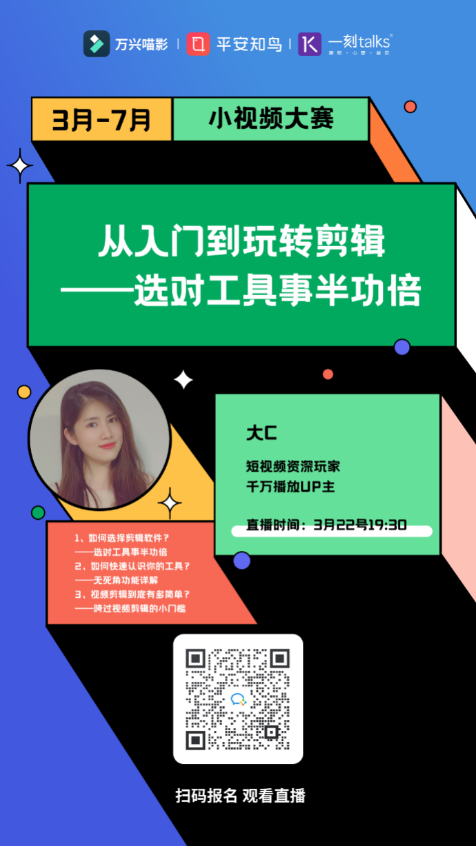 據(jù)悉,#一分鐘SHOW職場干貨#小視頻大賽自3月求職季上線,將持續(xù)至7月底,為期4個月,大賽包含作品提交至平安知鳥APP、12場線上直播、線上初賽、晉級復(fù)賽、線下決賽及頒獎典禮等環(huán)節(jié)。根據(jù)規(guī)劃,大賽設(shè)有專家評審委員會、培訓(xùn)專家團,并設(shè)置數(shù)十萬獎金池,獲獎?wù)卟粌H將有機會瓜分獎金大獎,更有機會成為職場知識網(wǎng)紅“C位”出道。萬興喵影作為活動主辦方之一,在此次大賽中將提供視頻創(chuàng)意軟件工具、活動專用視頻資源包、千萬播放UP主視頻制作講解直播課等資源,全方位賦能選手輸出高品質(zhì)內(nèi)容。