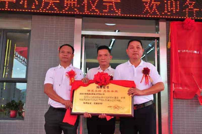 在落成典禮中,深圳安宏基控股集團(tuán)有限公司彭康輝董事將大樓辦公鑰匙移交給硁下村黨支部書(shū)記彭志康。村支書(shū)彭志康、五云鎮(zhèn)慈善會(huì)會(huì)長(zhǎng)彭志響一起贈(zèng)牌匾給深圳安宏基控股集團(tuán)有限公司彭康輝董事。