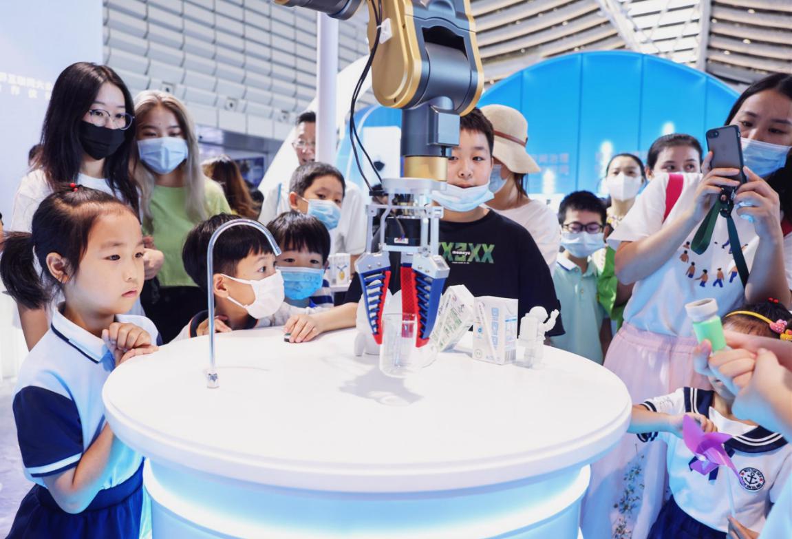 這牛奶和其他的不太一樣,很香濃。“離心精萃‘白科技’開啟臻濃新紀元”展臺一直就是博覽會現(xiàn)場的“人氣王”,這里以宇宙探索為主題,科幻感十足,火箭發(fā)動機噴出淡淡煙霧,三臺智能機械臂不停忙碌,人們排起長隊,品嘗由“離心精萃科技”現(xiàn)場調(diào)制的伊利臻濃牛奶。在這里,吸引觀眾的不僅是美味的伊利牛奶,也有滿滿的數(shù)字科技。