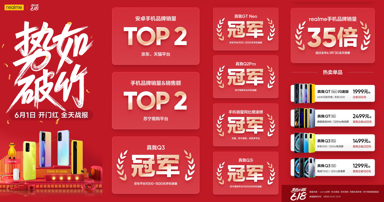 智能手機(jī)品牌realme真我公布618開(kāi)門(mén)紅首日戰(zhàn)報(bào):realme真我斬獲京東、天貓平臺(tái)安卓手機(jī)品牌銷(xiāo)量TOP2,蘇寧易購(gòu)手機(jī)品牌銷(xiāo)量&銷(xiāo)售額TOP2,成為天貓、蘇寧易購(gòu)、拼多多平臺(tái)手機(jī)銷(xiāo)量同比增速榜冠軍,手機(jī)品牌銷(xiāo)量超過(guò)去年開(kāi)門(mén)紅全天銷(xiāo)量35倍,創(chuàng)下品牌618開(kāi)門(mén)紅歷史最佳成績(jī)!