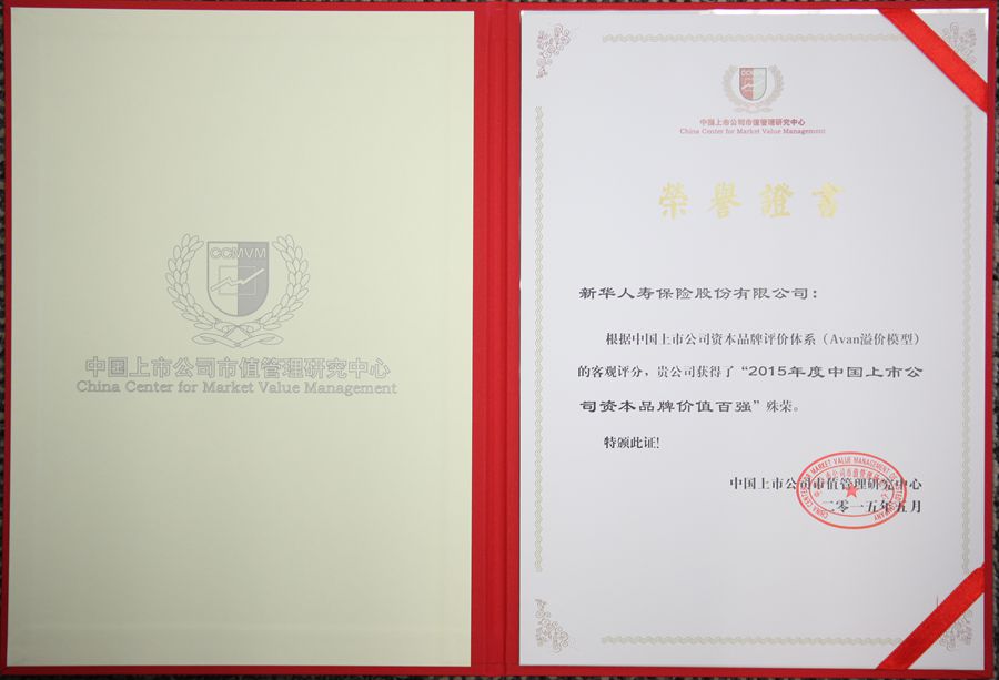 2015年5月,中國上市公司市值管理研究中心發(fā)布的”2015年度中國上市公司資本品牌價(jià)值百強(qiáng)“中,新華保險(xiǎn)赫然上榜!