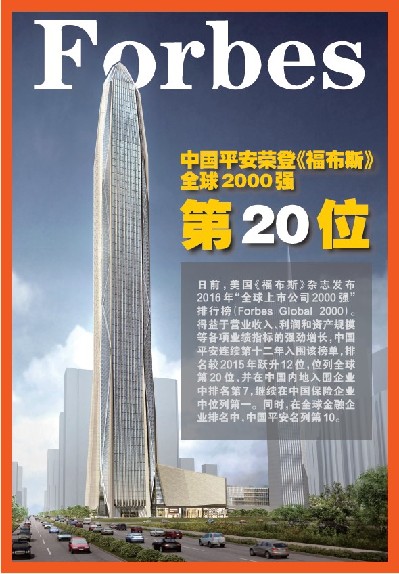 美國(guó)《福布斯》雜志26日發(fā)布了2016年“全球上市公司2000強(qiáng)”排行榜(Forbes Global 2000)。得益于營(yíng)業(yè)收入、利潤(rùn)和資產(chǎn)規(guī)模等各項(xiàng)業(yè)績(jī)指標(biāo)的強(qiáng)勁增長(zhǎng),中國(guó)平安保險(xiǎn)(集團(tuán))股份有限公司(以下簡(jiǎn)稱“中國(guó)平安” 或“平安”,股票代號(hào):香港證券交易所2318,上海證券交易所601318)連續(xù)第十二年入圍該榜單,排名較2015年躍升12位,位列全球第20位,并在中國(guó)內(nèi)地入圍企業(yè)中排名第7,繼續(xù)在中國(guó)保險(xiǎn)企業(yè)中位列第一。同時(shí),在全球金融企業(yè)排名中,中國(guó)平安名列第10。