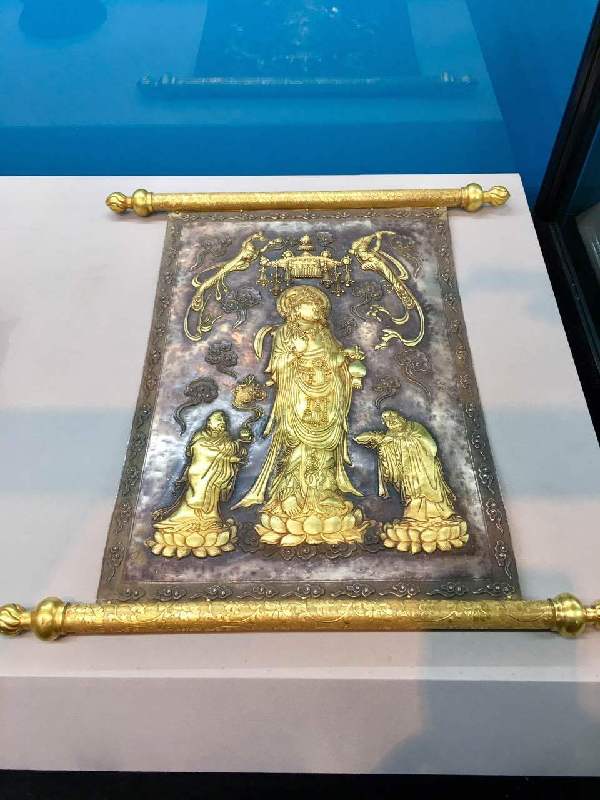 繼上個月舉辦的第一季“民國瓷畫展”,目前正在展覽的是第二季“佛像藝術(shù)展”。展出了遼金時期的銀鎏金佛塔、宋代泥塑描金的書卷觀音像、唐代捶揲銀鎏金“佛說金色王經(jīng)”上下卷,還有南北朝時期的石雕彩漆描金思維菩薩像,這一期展出了29件展品。