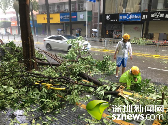 9月16日上午,蛇口街道南水社區(qū)黨委書記、婦聯(lián)主席李淑文,冒著可能被樹倒塌木砸傷的危險,浸泡在沒膝的雨水中幾個小時清理臺風(fēng)刮落路面的樹枝,讓來往車輛順利通行。
