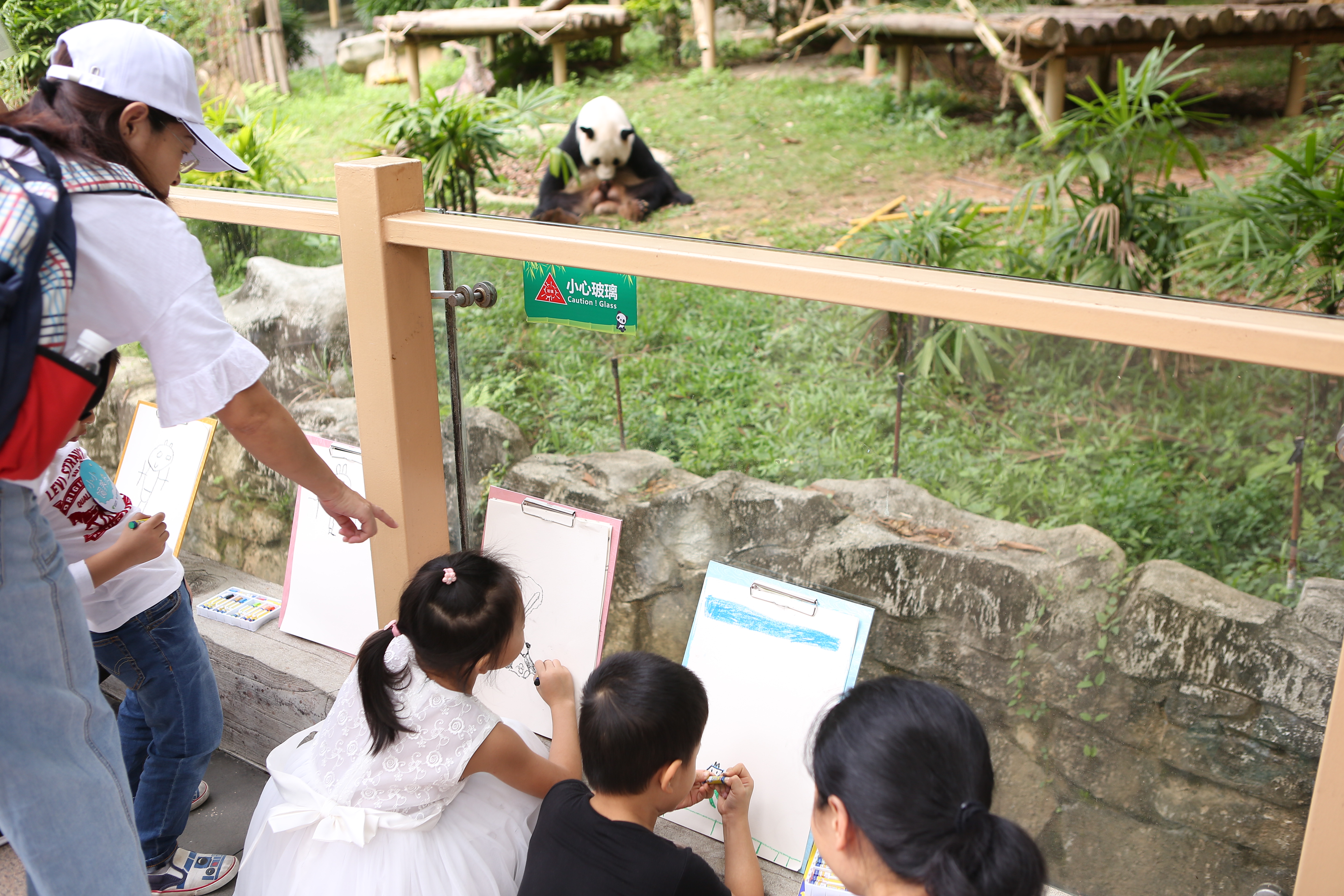 猿猴村的后面,是國寶大熊貓的家——熊貓莊園。小朋友們來到這里,瞬間被大熊貓圓滾滾的萌態(tài)所吸引。他們或坐或站,拿起畫板,完成了從“小飼養(yǎng)員”到“小畫家”的角色轉(zhuǎn)變。在認真觀察大熊貓后,小朋友們揮動手中的畫筆,將它們的萌態(tài)一一呈現(xiàn)在畫板上。