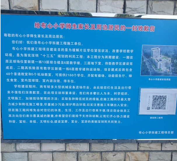 11月9日,有市民在深圳論壇發(fā)帖反映稱,“小孩如今就讀布心小學(xué)。可開學(xué)一個月后,就看到校內(nèi)有公示說學(xué)校將會原地重建?!痹摷议L對學(xué)生的安全情況表示擔(dān)憂:“這幾年因地下結(jié)構(gòu)受影響而導(dǎo)致路面坍塌的情況時有發(fā)生,現(xiàn)如今要在與教室目測距離不超過五米的地方建兩座分別為13層和6層的建筑,這樣大的工程量如果不分流,施工風(fēng)險可想而知。即使重建采用高新技術(shù),能夠保證教室的安全,但學(xué)生又如何能在學(xué)校與工地的混合期里度過至少四年以上的工期?粉塵和噪音對學(xué)生的影響也很大也可想而知。”