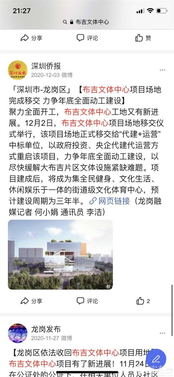 有關布吉文體中心的相關新聞報道截圖