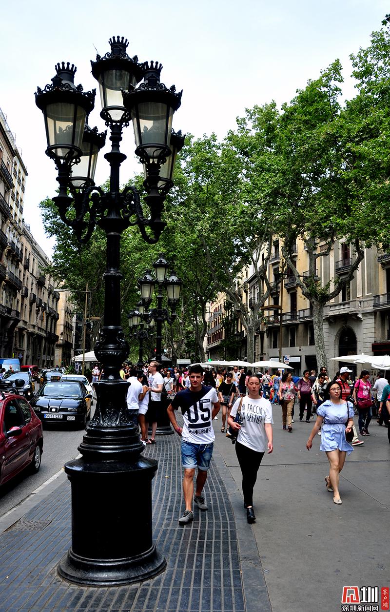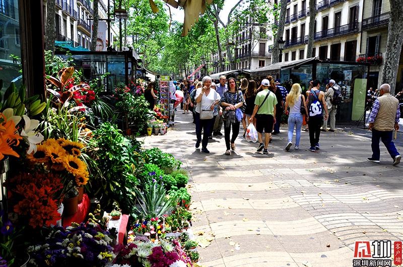 巴塞羅那舊城核心地段有一條長約一公里的寬闊步行街,因其中段有一些花店,被稱為蘭布瑯花街。圖為蘭布瑯花街。李仁奇 攝