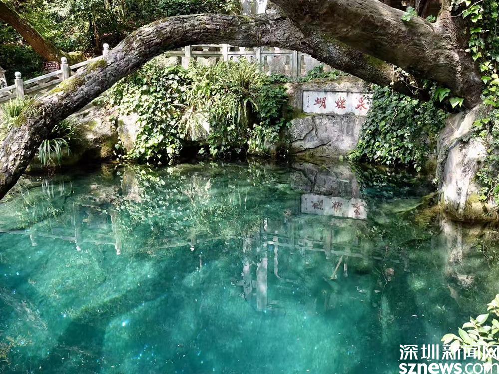 蝴蝶泉水清澈如鏡,水石相映,樹影搖晃。西壁上方鐫刻著郭沫若題寫的“蝴蝶泉”三個(gè)大字。池邊的蝴蝶樹,猶如一條青龍橫臥于泉池上。李仁奇 攝