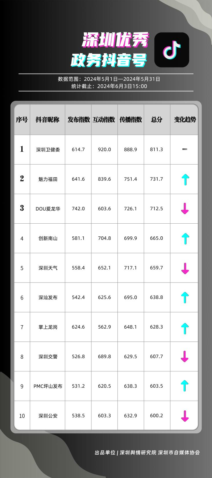 5月,共有10個政務(wù)抖音號獲得“深圳優(yōu)秀政務(wù)抖音號”稱號,分別是“深圳衛(wèi)健委”“魅力福田”“DOU愛龍華”“創(chuàng)新南山”“深圳天氣”“深汕發(fā)布”“掌上龍崗”“深圳交警”“PMC坪山發(fā)布”和“深圳公安”,多個政務(wù)抖音號能夠把握短視頻平臺宣傳要領(lǐng),持續(xù)發(fā)布優(yōu)質(zhì)信息內(nèi)容,做到了政務(wù)便民化、政務(wù)信息傳播高效化,為政務(wù)信息發(fā)布模式開創(chuàng)新渠道樹立了良好典范。