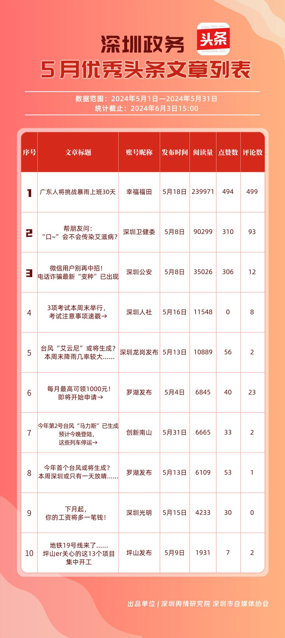5月,“幸福福田”“深圳龍崗發(fā)布”“深圳衛(wèi)健委”“深圳龍華”“深圳公安”“創(chuàng)新南山”“深圳光明”“羅湖發(fā)布”“深圳人社”“坪山發(fā)布”共10個政務(wù)頭條號能夠及時發(fā)布政務(wù)信息及公共服務(wù)信息,服務(wù)經(jīng)濟社會發(fā)展,滿足公眾信息需求,位列“優(yōu)秀政務(wù)頭條號”榜單,《廣東人將挑戰(zhàn)暴雨上班30天》《幫朋友問:“口~”會不會傳染艾滋???》等優(yōu)秀文章資訊深入人心。其他未上榜單位應(yīng)積極運用該新媒體平臺助力政務(wù)公開,讓權(quán)威聲音有效傳播到目標(biāo)受眾,更好地服務(wù)人民群眾。
