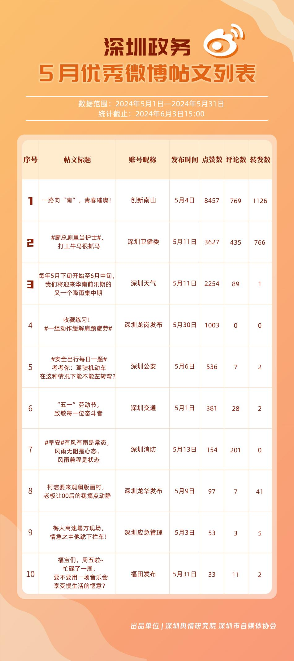 5月,“深圳天氣”“深圳衛(wèi)健委”“深圳消防”“深圳公安”“創(chuàng)新南山”“福田發(fā)布”“深圳應(yīng)急管理”“深圳市城市管理和綜合執(zhí)法局”“深圳龍崗發(fā)布”“深圳交警”等20個政務(wù)微博號入列“優(yōu)秀”名單。對比上期來看,“深圳天氣”“深圳衛(wèi)健委”“深圳消防”“深圳公安”發(fā)揮穩(wěn)定,能夠合理利用微博傳播渠道,持續(xù)輸出受眾喜聞樂見的高質(zhì)量內(nèi)容,“創(chuàng)新南山”“深圳龍崗發(fā)布”等微博號則在5月發(fā)力宣傳,整體傳播效果有所提升,收獲網(wǎng)民好評。