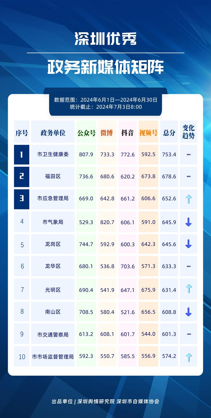6月,“深圳衛(wèi)健委”“i深圳”“深圳龍崗發(fā)布”“幸福福田”“深圳交通”“深圳教育”“濱海寶安”“創(chuàng)新南山”“深圳工會(huì)”“青春深圳”“同心鵬城”“深圳光明”等30個(gè)政務(wù)微信公眾號(hào),被評(píng)為“深圳優(yōu)秀政務(wù)微信公眾號(hào)”。6月,“深圳衛(wèi)健委”因內(nèi)容策劃出色、受眾互動(dòng)活躍、作品火熱“出圈”等,榮登排行榜首位?!皠?chuàng)新南山”“同心鵬城”“深圳社?!薄吧钲诮逃钡壬习窆娞?hào)也積極創(chuàng)作優(yōu)質(zhì)作品,抓住時(shí)下熱點(diǎn)趨勢(shì),集中發(fā)揮政務(wù)媒體傳播力量,推動(dòng)了政務(wù)信息傳播工作提質(zhì)增效。