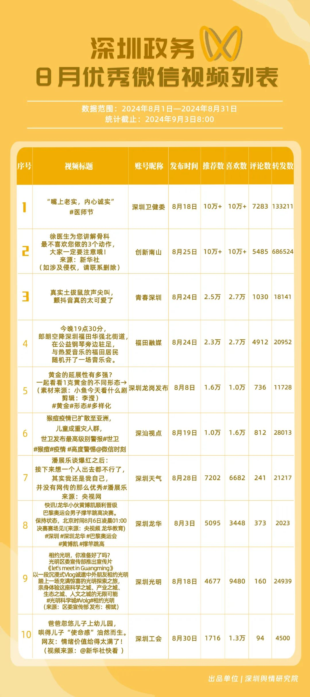 8月,“深圳衛(wèi)健委”“深汕發(fā)布”“掌上龍崗”“魅力福田”“深圳天氣”“深圳工會”“DOU愛龍華”“PMC坪山發(fā)布”“深圳交警”和“深圳公安”共10個政務(wù)抖音號獲得優(yōu)秀稱號,“深圳衛(wèi)健委”“深汕發(fā)布”“掌上龍崗”以高分居榜單前三,賬號有關(guān)“醫(yī)師節(jié)”“猴痘”“奧運金牌”的視頻獲得了較高的關(guān)注度和討論度,相關(guān)優(yōu)秀視頻在傳播信息的同時,也展現(xiàn)了深圳政務(wù)抖音號在內(nèi)容質(zhì)量、互動性和傳播度方面的實力。