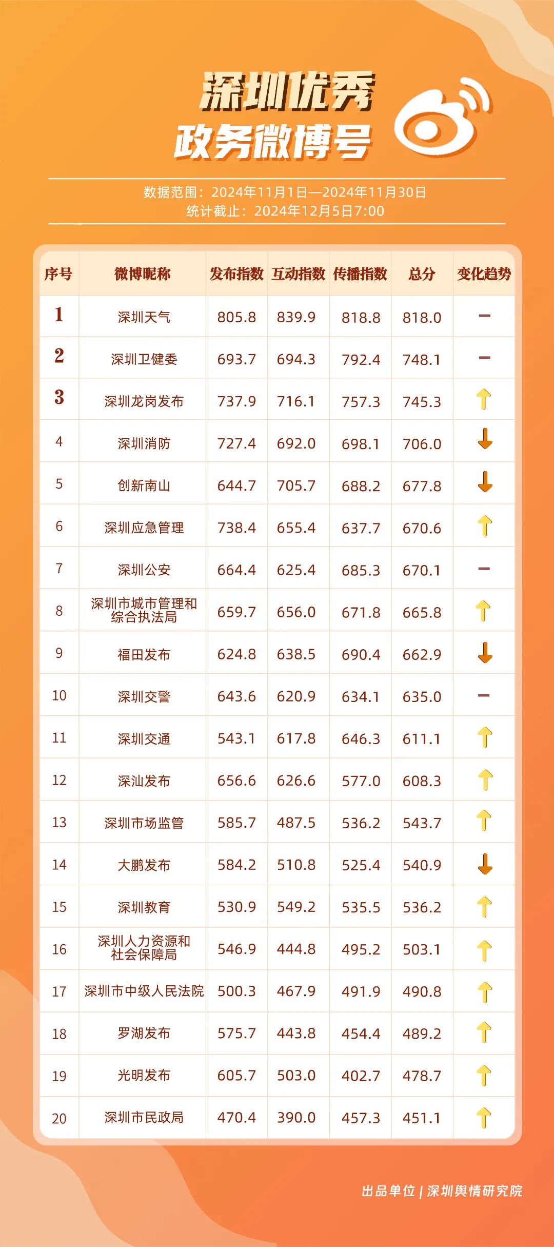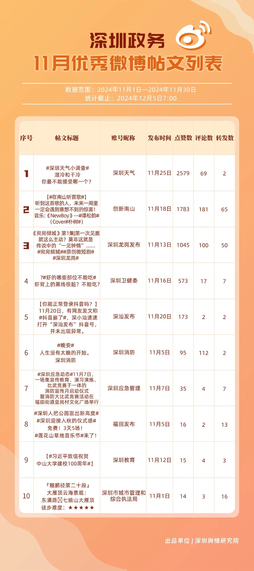 11月,“深圳天氣”“深圳衛(wèi)健委”“深圳龍崗發(fā)布”“深圳消防”“創(chuàng)新南山”“深圳應(yīng)急管理”“深圳公安”“深圳市城市管理和綜合執(zhí)法局”“福田發(fā)布”“深圳交警”等20個賬號入選“優(yōu)秀政務(wù)微博號”?!吧钲谔鞖狻薄吧钲谛l(wèi)健委”賬號在信息傳播上不斷精進,為市民帶來及時、優(yōu)質(zhì)且高效的資訊,內(nèi)容緊貼民生,贏得了市民的廣泛贊譽,排名穩(wěn)定在前2名。同時,“深圳龍崗發(fā)布”“深圳消防”和“創(chuàng)新南山”等賬號也能夠精準(zhǔn)滿足市民的信息需求,并在此基礎(chǔ)上提升市民閱讀體驗,推動了其在榜單上的穩(wěn)步提升,彰顯了政務(wù)微博的創(chuàng)新活力與社會價值。