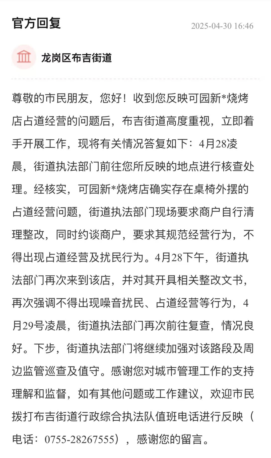 針對燒烤店占道經(jīng)營與凌晨噪音擾民問題,街道辦行動迅速,回應(yīng)中處置流程清晰。在現(xiàn)場核查確認(rèn)違規(guī)事實后,街道辦開具整改文書,開展復(fù)查、加強(qiáng)周邊監(jiān)管,解決商業(yè)經(jīng)營店鋪擾民問題,以規(guī)范行動守護(hù)居民“寧靜權(quán)”,展現(xiàn)了基層執(zhí)法的高效務(wù)實,切實提升了群眾生活幸福感。