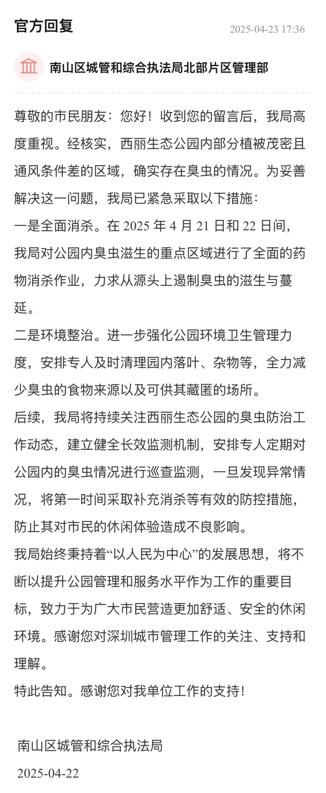 案例點評:臭蟲侵?jǐn)_住戶問題與居民生活舒適度息息相關(guān)。南山區(qū)城管部門快速響應(yīng),在問題反饋后48小時內(nèi)即開展消殺,遏制臭蟲蔓延;同步強(qiáng)化環(huán)境整治,切斷滋生鏈條。更值得肯定的是,回應(yīng)中還表示將建立健全長效監(jiān)測機(jī)制,動態(tài)跟蹤蟲情并及時采取措施,充分體現(xiàn)出該局問題發(fā)現(xiàn)快、處置措施實、長效保障穩(wěn)的務(wù)實作風(fēng)。