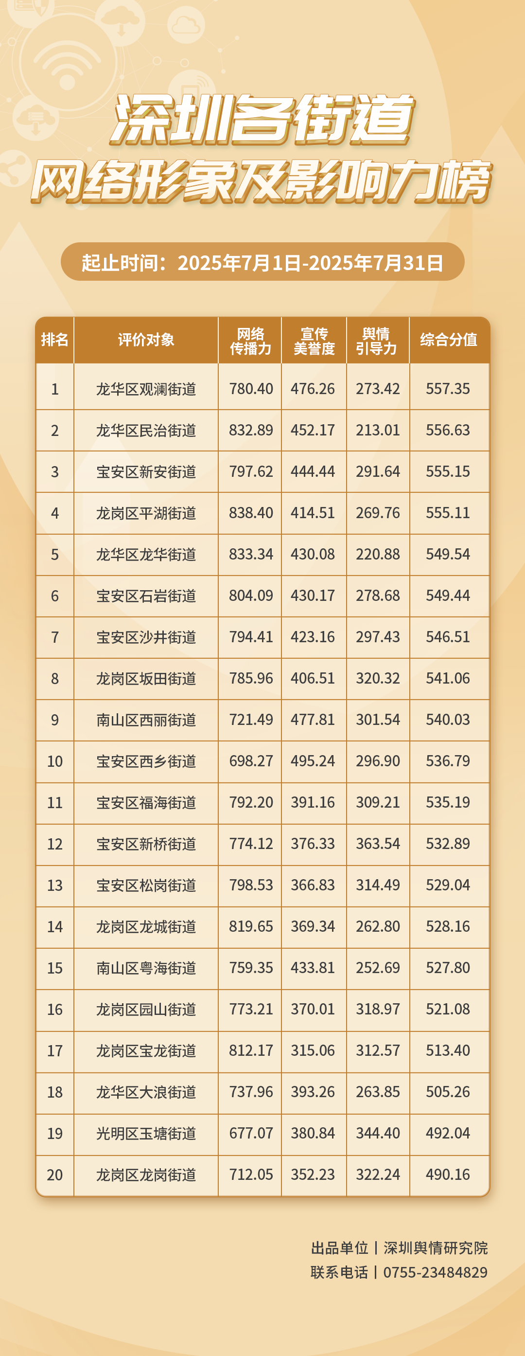 為深入了解深圳市各街道的網(wǎng)絡形象構建狀況和社會影響,推動街道治理“提質(zhì)增效”,增強城市高質(zhì)量發(fā)展動能,深圳輿情研究院編制推出《深圳各街道網(wǎng)絡形象及影響力榜》。榜單具有獨立客觀的評價體系,通過數(shù)據(jù)采集和分析,評估各街道的網(wǎng)絡傳播力、宣傳美譽度及輿情引導力,并對全市11個區(qū)共78個街道的網(wǎng)絡形象及影響力進行綜合排名。