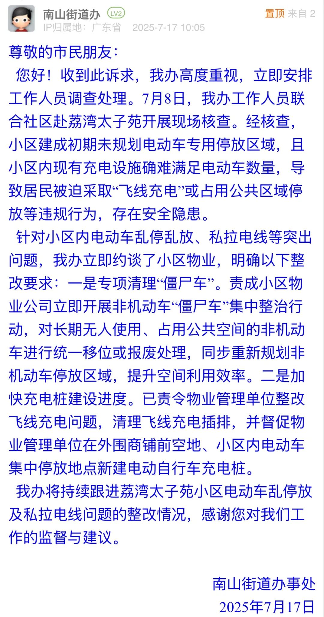 針對小區(qū)內(nèi)電動車亂停放、私拉電線等存在安全隱患的行為,南山街道辦接訴后迅速聯(lián)合社區(qū)核查,說明了歷史規(guī)劃不足的核心病因,通過約談物業(yè)推動整改,從“應急響應”到“系統(tǒng)治理”的務實舉措,回應了市民對消防通道暢通、用電安全的關切,以“標本兼治”的治理思路,為老舊小區(qū)電動車管理提供了可復制的解決方案。