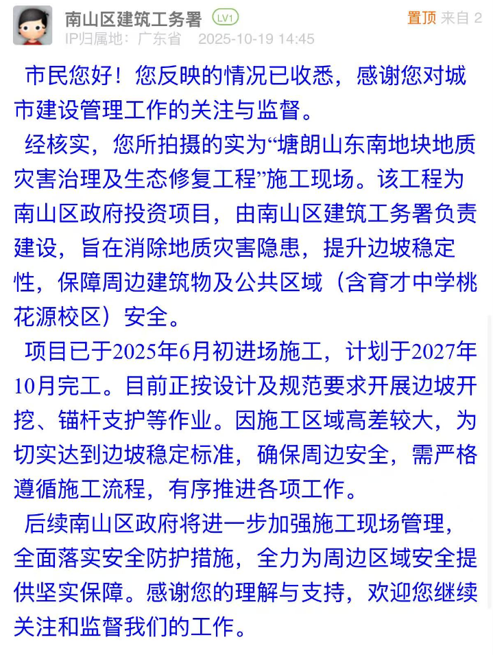 案例點評:針對市民疑慮,相關(guān)部門的回應(yīng)展現(xiàn)出“透明化+精細化”的治理思路:第一時間明確工程屬性并同步告知工期安排,主動消解市民對工程進展的不確定性擔憂;同時,南山區(qū)建筑工務(wù)署還表示后續(xù)將進一步加強現(xiàn)場管理,回應(yīng)關(guān)切。這種回應(yīng)思路既解決了市民的困惑,也通過可感知的舉措傳遞了對安全的重視態(tài)度,是城市工程類訴求處置中“信息公開”“風險閉環(huán)”的有效示范。