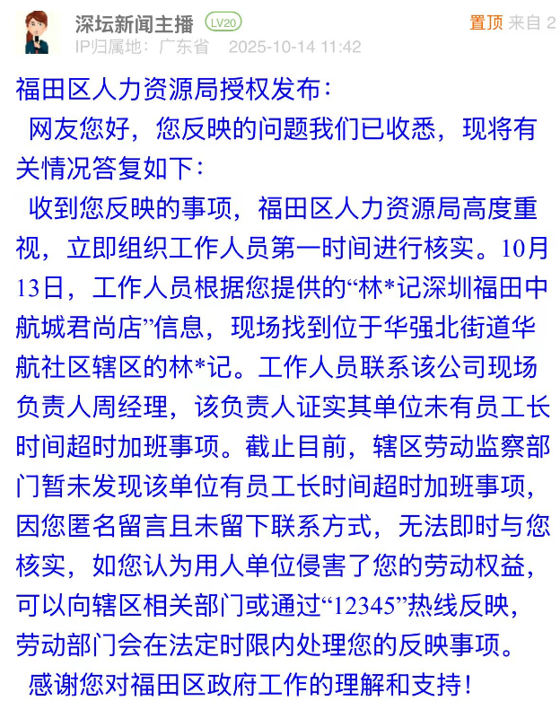 優(yōu)化建議:網(wǎng)民投訴的核心有兩點,一是外包公司無勞務(wù)派遣資質(zhì)卻代繳社保、發(fā)放工資,二是工作時間過長。福田區(qū)人力資源局雖回應(yīng)已核實涉事餐飲單位“無長時間超時加班”,但對網(wǎng)民反映的外包公司無資質(zhì)這一關(guān)鍵問題未作回應(yīng)。此情況反映出,資質(zhì)核查工作亟需加強,如對相關(guān)餐飲單位開展用工合規(guī)專項檢查,以精準舉措解決無資質(zhì)外包這一核心痛點,提升市民對勞動者權(quán)益保障工作的認可度。