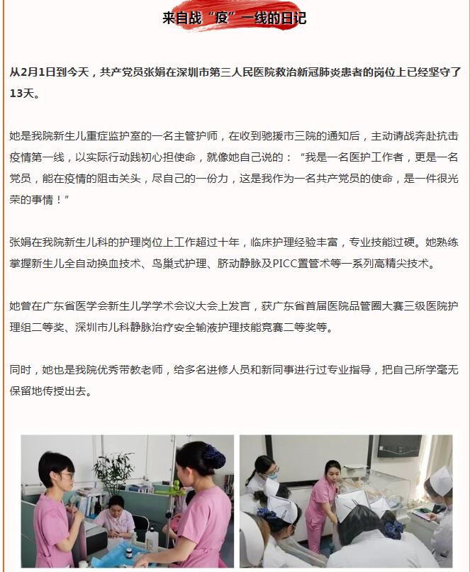 賴碧娟是深圳市婦幼保健院急診黨支部書記、急診科護(hù)士長。作為一名老黨員,抱著“疫情快些得到控制,最大程度減少損失”的信念,新冠肺炎疫情期間,她帶頭沖在一線,整個春節(jié)期間基本都在醫(yī)院加班?!拔覀兗痹\科全體黨員和醫(yī)護(hù)人員都嚴(yán)陣以待。只要有需要,所有人都沖在一線?!?/p>