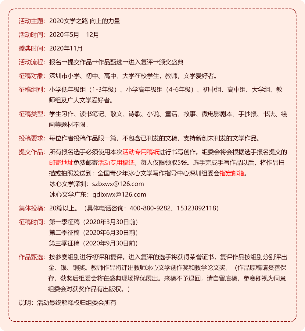 11月21日,由深圳新聞網(wǎng)、全國青少年冰心文學(xué)盛典中國·深圳組委會(huì)聯(lián)合主辦,博恩國際教育集團(tuán)承辦的“第十五屆全國青少年冰心文學(xué)盛典”在深圳商報(bào)社大廈成功舉行。[詳細(xì)]